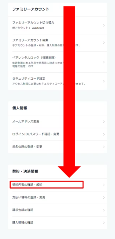画面を下へスクロールし、契約・決済情報という項目の中にある「契約内容の確認・解約」をタップします。