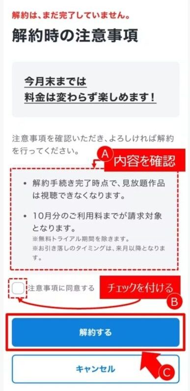 最後に「解約時の注意事項」を確認し、「同意する」にチェックを入れた後、一番下の「解約する」ボタンをタップします。