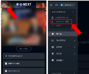画面左上にある「三(メニューボタン)」をタップし、メニュー一覧の中から「アカウント・契約」を選択します。
